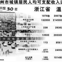 (一)工业化快速发展,综合经济实力显著增强。30年来,温州工业化、城镇化快速发展,产业结构发生巨大变化。1993年以后,工业在国民经济中的比重稳定在50%左右,第三产业比重达到40%以上。2006年,全市规模以上企业达到5757家,全市拥有工业产值超亿元企业532家,超5亿元企业59家,超10亿元企业31家。拥有58个中国驰名商标,获得33个国家级生产基地称号,特色产业集群优势明显。16家企业集团跻身首届中国企业集团竞争力500强。1978—2007年,地区生产总值从13.2亿元增长到2145亿元,增长161倍,年均增长15.1%;人均地区生产总值从238元提高到28362元,年均增长13.8%;财政收入从1.35亿元提高到293.3亿元,增长216倍,年均增长20.4%。