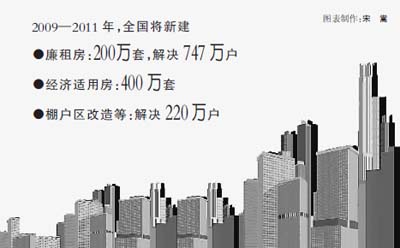综合算下来,2009—2011年,通过9000亿元住房保障投资,将解决约1300万户低收入家庭的住房困难问题。根据2005年建设部和民政部的调查,全国约有1000万户住房困难的低收入家庭——他们的安居问题,3年以后将基本解决。