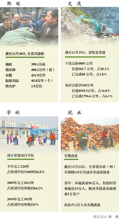 根据有关部门统计,四川全省要在自建过渡房中过冬的农户约有530160户。截至12月19日,全省已开工新建城镇永久性住房6万套,仍有34万套城镇永久性住房尚未开工。