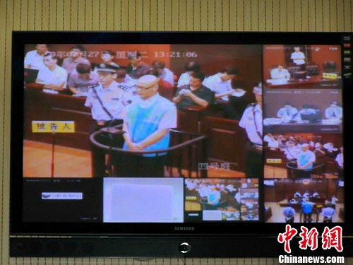 资料图:2010年7月27日上午,备受关注的原浙江省温州瓯海区委书记谢再兴杀害情妇案在杭州市中级人民法院开庭。剃着光头,身穿蓝色马甲的谢再兴出现在法庭上,对犯罪事实供认不讳,详细交待了与被害人从发生口角到最终将其杀害并分尸、抛尸的全过程。李飞云 摄