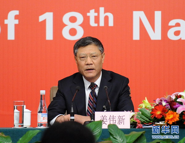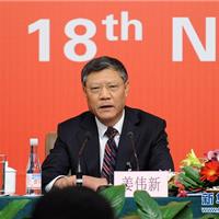 2012年11月12日,中国共产党第十八次全国代表大会举行第四场记者招待会,请住房城乡建设部部长、党组书记姜伟新,国家发展和改革委员会副主任、党组副书记朱之鑫,环境保护部部长、党组书记周生贤,人力资源和社会保障部副部长、党组副书记杨志明介绍中国民生领域工作情况,并回答记者提问。图为姜伟新介绍有关情况。新华网陈竞超摄