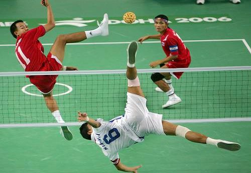 藤球是一种独特的古老体育运动项目,它有着悠久的历史。运用自己的脚腕、膝关节等同时夹、顶球,不让球落地,类似我国民间踢花毽子。藤球跟排球比赛有些类似,所不同的是以脚代手,所以又叫“脚踢的排球”。
