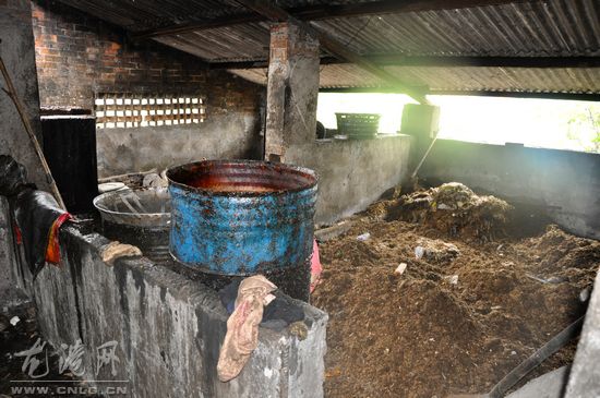 记者发现该作坊位置偏僻,人烟罕至,左右都是饲养场,还有灌木丛遮挡。如果不是特别留心,很难发现。进入这家加工厂时,顿时傻了眼,这是一间30多平米左右的加工厂,里面阴暗潮湿,散发着难闻的油脂味,其中还夹杂了浓烈的腐败味道,地面也被油污侵蚀,两口铁锅冒着热气,里面是黑乎乎的油渣,一口锅装着不明液体,分不清是油还是水,墙角堆满了猪皮,边上的塑料大脸盆里还有来不及放进锅中的碎肉末。