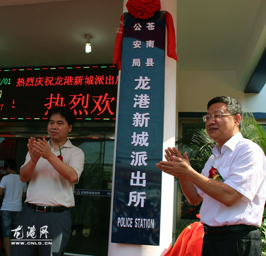 随后,县委常委、常务副县长黄锦耀,县委常委、龙港新区党委书记、管委会主任、龙港镇委书记丁振俊为龙港新城派出所揭牌;县委常委、县公安局局长蒋荣国为龙港新城派出所授印。