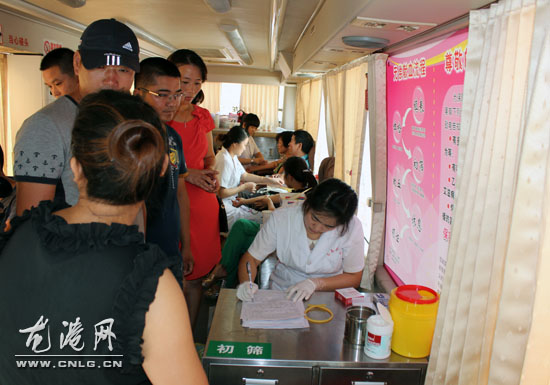 在献血现场,记者看到献血登记点已经围满了献血的志愿者,个个依次排队,经过填表、化验血型、量血压等程序后,检查合格者方献血。在采血车上也已是站满了献血者,都在捋袖献血。活动中,附近闻讯而来的村民也纷纷加入到献血行列,由于临时过来献血,没有做好献血前的准备工作,所以一部分村民体检没通过,不过他们表示下次会做好充分准备再来献血,献上自己的一份爱心。