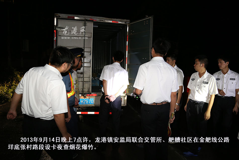 龙港网9月14日讯:(陈记)2013年9月14日晚上7点,温州苍南第十二届龙港舥艚开渔节来临,烟花爆竹正处于产销旺季,为了确保安全,龙港镇安监局联合龙港交管所执法人员和舥艚社区干部组织人力、物力在金舥公路垟底张村路段设卡开展夜查。此次夜查重点检查从外地流入舥艚社区境内非法运输车辆。共检查可疑车辆10余辆,未发现非法运输烟花爆竹现象。