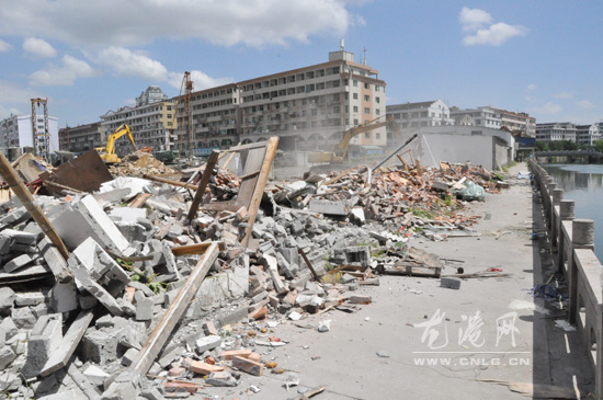 龙港网9月20日讯:为了扎实推进城区环境综合整治工作,实现河道两岸洁化、绿化、美化的目标,日前,龙港镇两违办联合国土、住建、妇联、电力等部门对我镇沿河北路沿河违章建筑进行强制拆除。