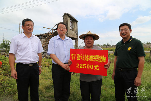 龙港网10月9日讯:(陈记)今天中午,浙江保监局副局长汤学斌率浙江人保领导一行在苍南县委常委丶龙港镇委书记丁振俊陪同下到湖前社区双龙村为黄定昆送上强台风"菲特"政策性农村住房保险理赔金22500元。