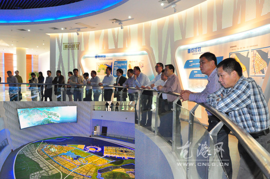 茅临生一行首先实地考察了龙港新城规划展示馆。在展示馆顶层鸟瞰江南海涂围垦工程,建设工地上车来车往,一片热火朝天的景象。据了解,江南海涂围垦工程围区总面积4.34万亩,建成后将提高我县沿海防洪挡潮能力,也能促进城市化建设和滨海工业发展,为苍南社会经济发展提供宝贵的土地资源。日前,江南海涂围垦单位工程和合同工程同时通过完工验收,眼下海涂围垦区吹填软基处理工程正有序推进。
