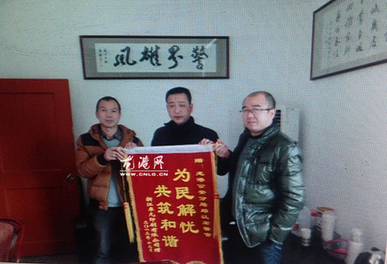 龙港网12月25日讯:(本网编辑陈峰)昨日,湖南籍精神障碍男子刘某亲属把一面写有“为民排忧 共筑和谐”的锦旗送到龙港公安分局民警邓以宏手中,感谢他在亲属突发精神病时给予及时的救助。