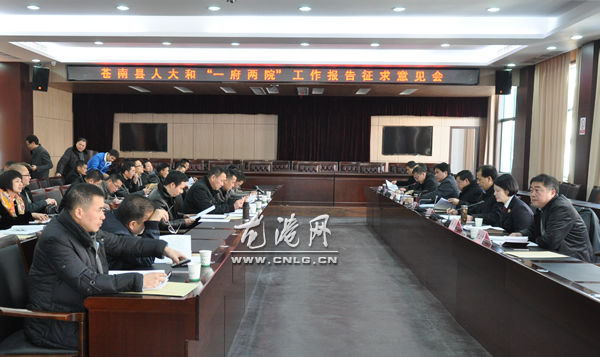龙港网2月11日讯:昨天下午,县人大和"一府两院"工作报告征求意见会在龙港召开,就即将提请苍南县九届人大三次会议审议的县人大和"一府两院"四个工作报告征求意见稿,征求县人大代表们的意见和建议。县镇领导黄锦耀、丁振俊、蓝德超、王忠秀、上官光强等出席了会议,县法院、检察院负责人,龙港片区的县人大代表,社区书记等参加这次会议。