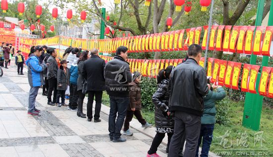 记者先后来到江滨公园、象湖公园,看到公园内张灯结彩,上百条灯谜也早已挂好,吸引了不少男女老少,有不少是家长带着孩子来的,也有的是同学结伴而行,甚至是全家老少齐上阵。居民有的站立在灯谜前皱着眉苦思冥想,有的打电话咨询朋友,有的拿着纸笔写写画画,有的干脆在手机上记下谜语编号和猜出的谜底,有的相互切磋交流猜谜的技巧……活动现场热闹非凡。正确猜中谜语的市民可获得精美奖品一份。