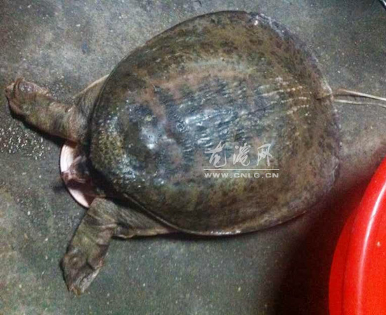 当晚7点多,记者来到方尚友家,看到这只甲鱼放在一只塑料盆中,背部色泽光滑,呈淡黄色,裙边柔软宽大。由于体形较大,塑料盆并没多少空间让它自由挪动。甲鱼体积大,脾气貌似也不小,方尚友把它从盆里拿起时,它立马划动起来,嘴巴撑的老大,并转动着脖子,眼睛瞪着周围的人。据方尚友说,这只甲鱼是他在宜山周边一小河里捉到的,回来称了一下,足足八斤半。