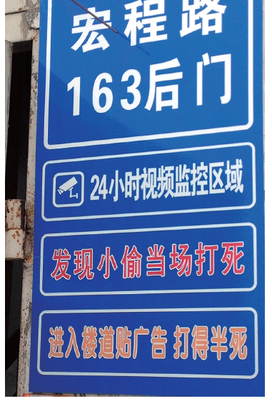 警告牌蓝底白字,上方写有门牌号码,下方标注有几行字,分别写有“24小时视频监控区域”、“发现小偷当场打死”、“进入楼道贴广告打得半死”等字眼。其中,贴在居民楼前方的警告牌只有两行字,少了“进入楼道贴广告打得半死”的字眼。