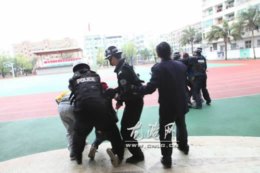 与此同时,“歹徒”闯进校园劫持学生人质,值日组长和值日教师迅速增援,与保安合力在校园内将“歹徒”降服,龙港公安分局民警及时赶到,制止暴力并将“歹徒”带离现场,学校宣布解除警报。