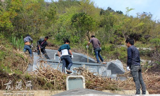 龙港网4月11日讯:昨天上午,龙港镇民政部门联合云岩社区开展青山白化专项整治行动,对辖区内联友村一带新建、翻新的坟墓进行了强制拆除。