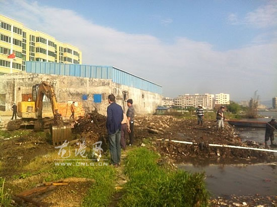 龙港网4月12日简讯:龙港新城黄库利得隆超市后河道"河道垃圾成山"日前被网民曝光后,受到龙港镇领导高度重视。昨天下午,龙港镇农经局与新城社区联合行动,釆用挖掘机和河船对河道进行综合整治清理。