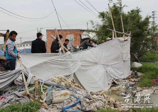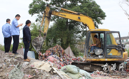 龙港网5月6日讯:废布角料褪了白,可是周边环境却染黑,不仅破坏了水质,还污染了空气。今天上午,龙港镇环保分局、安监、生态、消防等部门联合组织对江山社区的非法褪色布角料点进行了连续整治,副镇长章定宇到现场督察。