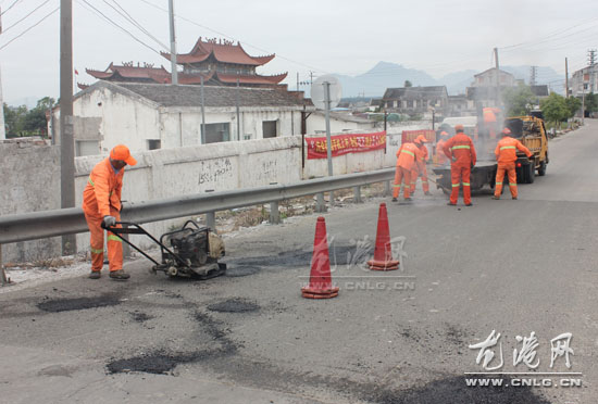龙港网5月8日简讯:今天上午,龙港镇江山社区的湖振线公路段,几位身穿橙色工作服的道路维修工人正在对破损的桥面进行修补。由于重车超载的影响,湖振线公路的兴隆桥、新河等多处桥梁出现了桥面破损、梁板断裂,存在极大的安全隐患。因此,为了确保此公路段的通车安全,我镇对这些桥面破损处进行修补,几个修复区域都铺上了沥青石子,让过往车辆和行人能够放心通行。
