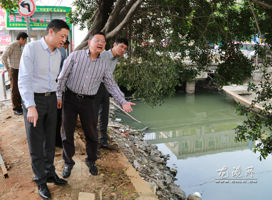 黄寿龙一行到龙跃河整治工程项目第二期现场时,看到河道内的垃圾已经全部被清除,河岸正在彻石,虽然河道两旁工程还没有全部完成,但整个河道淤泥已基本清理完毕。
