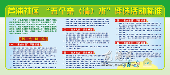 开展“亲水家庭” “亲水老人” “亲水媳妇” “亲水孩子” “亲水村庄” 暨“五个亲(清)水”评选活动,对社区内在五水共治中涌现出的先进个人、家庭和集体给予表彰,结合芦浦当地语言文化实际,制定发布评选标准,我们采用“清水”的谐音“亲水”作为我们的主题,使活动能够更加贴近生活,让每名群众都对活动主题朗朗上口,确保活动精神入心入脑。
