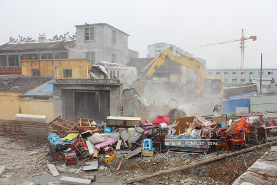 龙港网5月28日讯:为深入推进宗教和民间信仰活动场所违章建筑专项整治工作,昨天下午,龙港镇组织镇两违、民宗、国土、公安、住建、妇联等多部门,对龙港镇白沙社区世纪大道旁,象北村段一违章寺庙进行强制拆除。镇委副书记、李孝取,镇委委员、副镇长谢磊在现场指导拆违工作。
