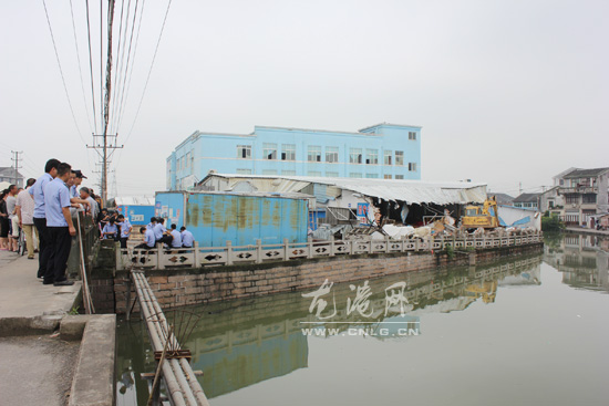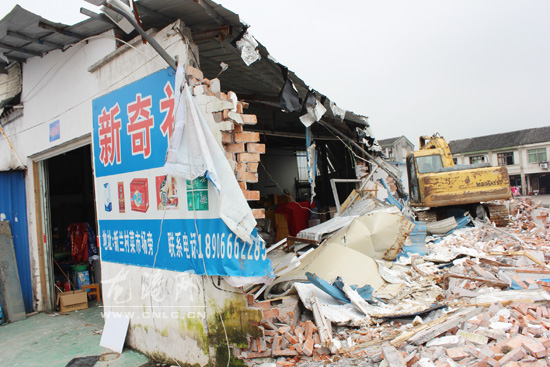 龙港网7月2日讯:为了进一步推进龙港镇“三改一拆”工作,促进城乡环境的美化整治,昨日,龙港镇组织两违、水利、国土、住建、电力等部门,对龙港镇湖前社区新兰村菜场旁的违章建筑进行强制拆除。