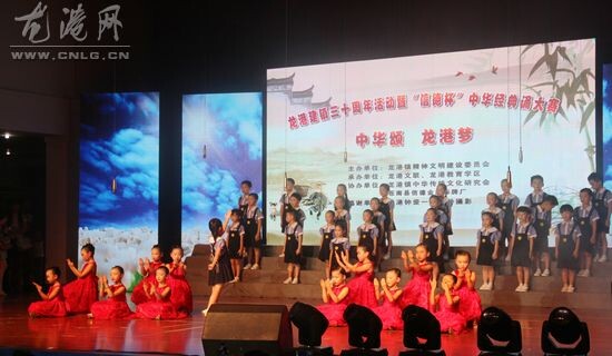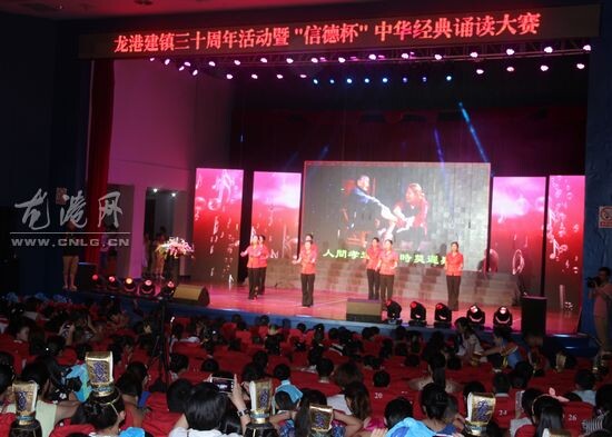 龙港网7月9日讯:古韵萦绕,诗香阵阵,昨天下午,龙港镇举办建镇三十周年“信德杯”中华经典诵大赛,优美的经典诗文,精彩的诵读表演,奏响了中华民族传统文化的和谐旋律。比赛由龙港镇精神文明建设委员会主办主办,龙港镇文联及教育学区承办,来自全县各幼儿园、小学等23个单位参加了比赛。县镇领导郑德菊、李孝取、吕存阳、朱文胜出席活动并观看了演出。