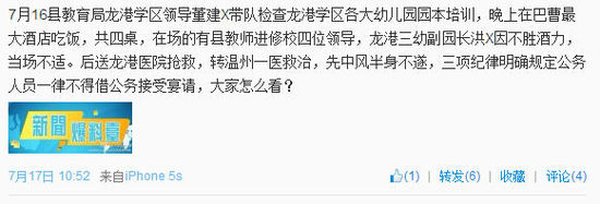 龙港网7月18日讯 7月17日,有网民在新浪微博上发布“幼儿园园长陪酒致中风”的帖子后,该县委领导高度重视,第一时间作出批示,要求全力做好患者的救治工作,要求县纪委深查细查,正风肃纪,杜绝此类事件再次发生。7月18日下午,县纪委通报事情基本情况和调查处理结果。
