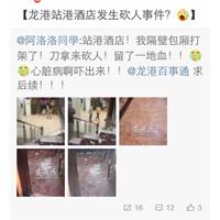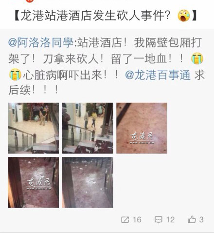 龙港网24日简讯:(本网编辑徐登威 陈记)7月23日晚上11点27分,龙港镇一网友@阿洛洛同學 在新浪微博发帖称:“站港酒店!我隔壁包厢打架了!刀拿来砍人!留了一地血!!心脏病啊吓出来!!”后,引发广大网友热议和转发。