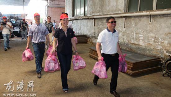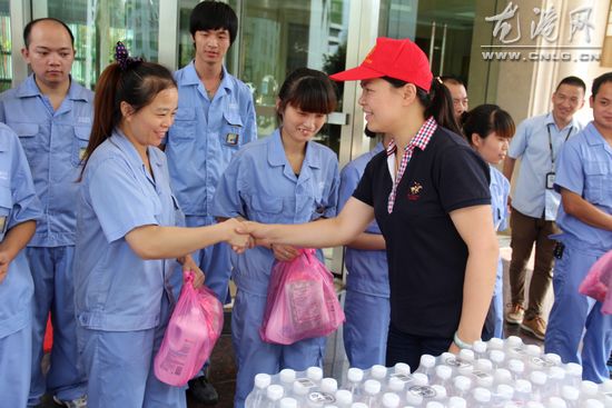 龙港网7月30日讯:顶着炎炎烈日,今天上午,苍南县新居民服务管理局局长周碧素率领”夏送清凉“慰问组一行来到龙港镇看望慰问奋战在高温下的新居民们,为他们送上防暑用品,带去党和政府的深切关怀,镇委副书记吕存阳陪同慰问。