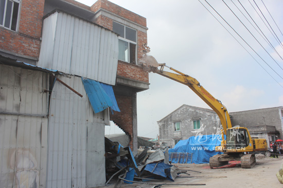 记者现场看到,这栋建筑位于村道路边上,屋内存放的物品已被工作人员搬出。据执法人员介绍,他们早就下发拆违告知书,要求违章户搬离住处、自行拆除,但违章户并没有按时自行拆除。行动中,拆违组对违章建筑进行了断电处理,在大型钻机和挖机的作业下,违章建筑被强制拆除。