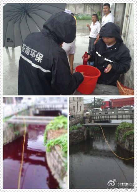 随后,苍南县环保局龙港分局、县环保监察大队执法人员和县环保检测站工作人员赶到现场进行排查。在桥河下排查时,发现污染源并打捞上岸一个被染得玫瑰色的塑料袋,里面装着疑似可溶性颜料。