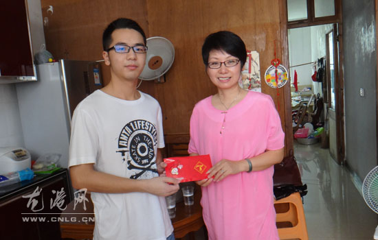 龙港网8月29日讯:2014年8月24日上午,龙港东城幼儿园园长、民进苍南总支会员叶旭霞与县委统战部部务成员王中孝,民进苍南三支部陈啸游主任,女企业家商会陈燕等一行人来到贫困学子徐顺铁家,叶园长将5000元助学金赠予学子徐顺铁,资助他完成大学学业。