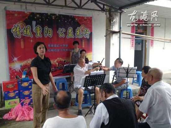 龙港网10月1日讯:昨天上午,龙港镇湖前社区敬老院里歌声、琴声、二胡声、欢笑声吸引了附近很多的居民赶来观看。在重阳节来临之际,苍南县红十字携手龙港弘毅公益组织13名志愿者来到湖前社区敬老院,开展“情暖重阳•公益先行”敬老活动。