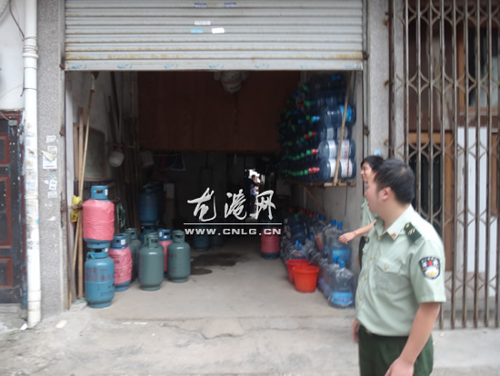 龙港网10月10日讯:今天上午,消防站联合龙江社区对华电商贸城开展消防安全大检查时,在华电商贸城A幢108号旁发现一非法储存经营煤气罐点,且该点里面住人、设置了厨房,存在极大的消防安全隐患。