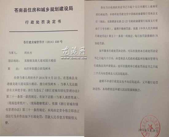 9月30日,当事人周世杰来到龙港综合管理执法大队接受行政处罚,经查周某于2014年9月22日,在龙港大道双园大楼前,擅自砍伐树木,当事人周某无法提供有关审批手续,该行为违反了《浙江省城市绿化管理办法》第三十一条第一款规定:被处罚10600元。还要购置三棵白叶榕树,价值5千余元,进行恢复性补种。