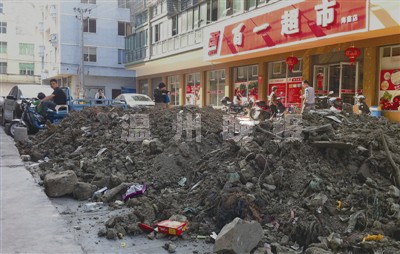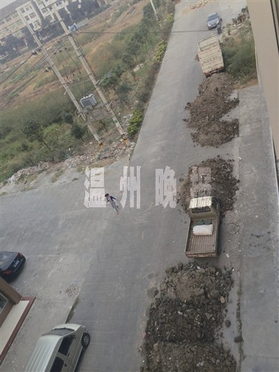 昨天上午,记者接到一个投诉,来自苍南龙港镇海城社区朝北处村的缪先生,他说:“我家门口被一大堆泥土和石头给堵住了,边上的其他几户人家也是。为了逼我们交钱,他们竟然想出这种办法!”昨天下午,记者来到龙港缪先生所说的这条马路。它位于海城菜场边,长约400米,有两条双向车道。道路两侧是居民房,开着超市、家电、服装等几十家店。据了解,这条马路平时人流量较大,目前还没有命名。可是,如今在道路南侧20多间店面的门前,堆放着一排泥土和砂石以及一些生活垃圾,约半个人高,占据了一条车道。