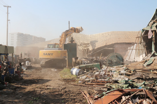 记着在现场看到,模具厂都是由简易工棚搭建而成,整体十分破旧。厂内各类模型、模具杂乱堆放,制作环境十分恶劣。据了解,这3间模具厂占地1万多平方米,已存在二十来年时间,由于生产设施落后,环境恶劣给周边居民生产生活造成一定影响,执法人员动用大型挖机进行强制拆除。