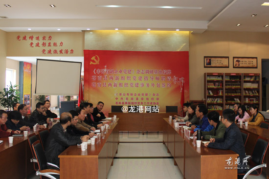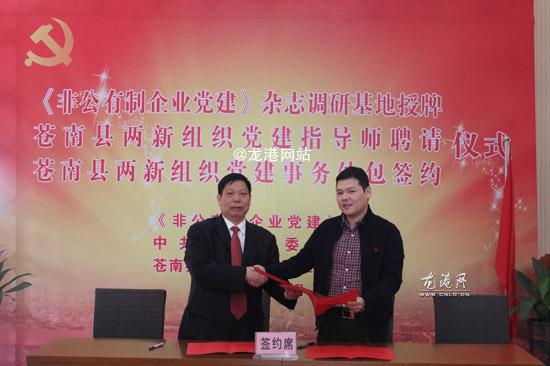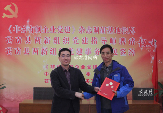 龙港网11月23日讯:(徐登威 陈记)11月21日上午,《非公有制企业党建》杂志调研基地授牌、苍南县两新组织党建指导师聘请暨苍南县两新组织党建事务外包签约仪式在龙龙港仪邦集团举行,县委组织部部务会议成员、组织员管理办公室主任杨崇演,《非公有制企业党建》杂志总监杜大强,编辑部主任王晓宇出席仪式,灵溪、龙港、金乡、钱库、宜山等五个镇两新工委专职副书记,县两新组织党务工作者协会会长、副会长参加仪式。《非公有制企业党建》杂志是全国非公企业党建领域最具影响力的指导性刊物,被誉为“中国非公党建第一刊”。仪式上,县两新组织党务工作者协会会长陈如奏介绍了协会成立以来的工作开展情况,杜大强总监为《非公有制企业党建》杂志调研基地授牌,杨崇演主任为杜大强、王晓宇两位同志发放聘书,正式聘请他们为我县两新组织党建指导师。县委组织部、灵溪等5个镇还在仪式上分别与县两新组织党务工作者协会签订了“党建事务外包”协议,这是两新党建工作的一种创新举措,也是购买社会服务的一种有效探索。