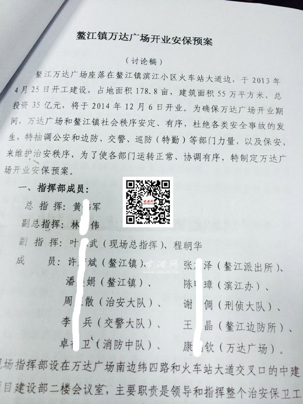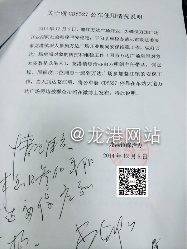 龙港网12月10日讯:今天 @龙港网站授权发布:2014年12月6日,鳌江万达广场开业,为了确保万达广场开业期间社会秩序平安稳定,平阳维稳办请示市政法委要求龙港镇派人参加万达广场安保维稳工作,做好万达广场房闹对象的防控和维稳工作(因为万达广场房闹对象大多数是龙港人),龙港维稳办主任方明朗率何必标、周振度等二位同志一起到万达广场参加鳌江镇安保工作,当天到达鳌江后,将公车浙CDY527停靠在车站大道万达广场旁边被群众拍照在微博上,现特此说明。