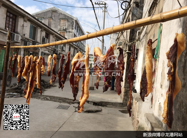 今天上午,本网记者路经湖前社区和城北社区等地方时,看到了主妇们把酱油肉、高粱肉、腊鸡腿、鱼鲞等腌制好的年货必备品纷纷挂出窗外、门前或朝阳处进行晾晒,使得空气中散发出了阵阵浓郁的香气,令人垂涎欲滴。而一片片沐浴在阳光下的酱油肉、腊肠等,成了不少人家中的特色风景线,也把冬日里的龙港装点的年味十足。