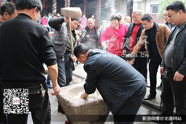 活动现场,村民们熟练的用糯米粉加糖浆调配均匀,然后放上蒸笼蒸,熟后就立刻拿出来放在石臼里,大家轮番上阵,你一下我一下的用石榔“锤”出来热腾腾的年糕,清香四溢吸引了村民,争着抢来趁热吃。
