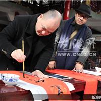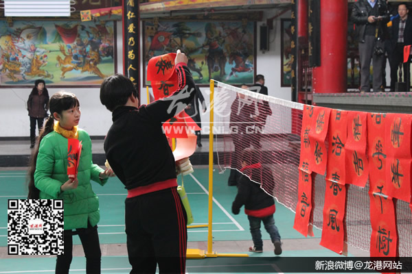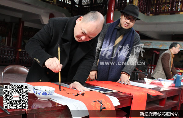 现场书法家挥毫泼墨写春联 图为副镇长陈贤选在写春联送祝福