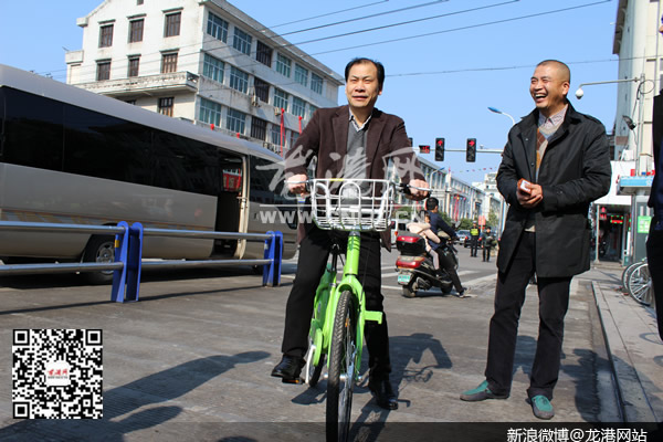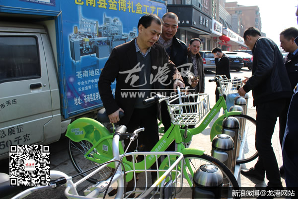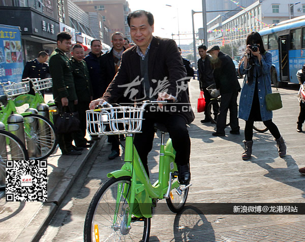 龙港网2月16日讯:今天上午,龙港镇公共自行车系统(一期)终于揭开了面纱,龙港公共交通正式步入低碳绿色出行时代。县人大常委会副主任、龙港镇长王忠秀亲自到现场试车,体验公共自行车低碳绿色出行。