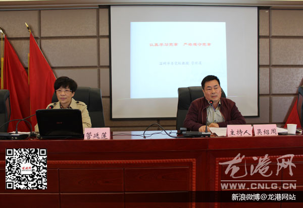 习近平总书记强调,党章就是党的根本大法,是全党必须遵循的总规矩。而今天下午,培训会上就邀请了温州市委党校教授管延莲进行以“认真学习党章,严格遵守党章”为主题的讲课。讲师管延莲结合PPT和图标信息说明,从政党的概念、产生和其功能为着手点,循序渐渐地阐述了党章的重要地位和作用,以及十八大党章的基本内容和要求。