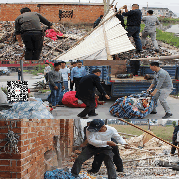 在江山社区平桥村看到,一些布角料回收站为节约成本,经营户大部分采用木头篷布搭建,在露天场所堆积大量废旧物品,经长期雨水浸泡太阳暴晒后散发出刺鼻的臭味,周边环境卫生状况差,靠近河边的直接往河道堆积垃圾,造成河水发黑发臭,严重影响了周边居民生活环境。执法组出动拆除专业工人、运输车,对这些废旧品回收点,开展强制清理行动。现场,工人来回地将废旧物品装上运输车,并用工具敲掉整治点违法乱搭建棚屋,清除现场。