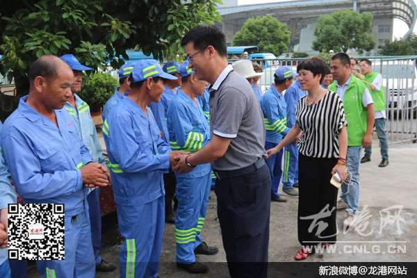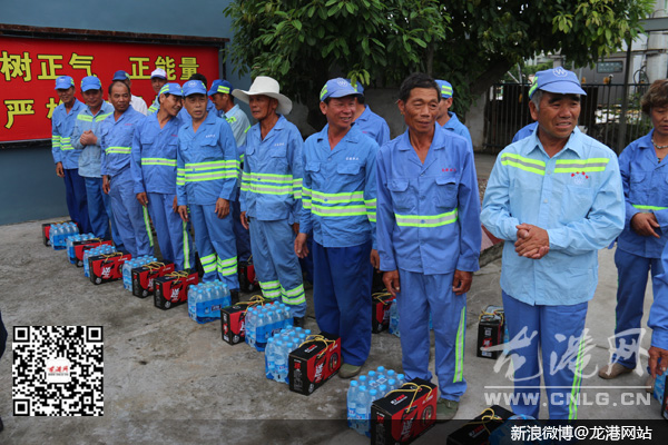 龙港网7月24日讯:为了推进龙港建设美丽乡村行动,环卫工人这群“城市美容师”始终坚守在防卫工作的第一线,今天下午,苍南县消环公益服务中心的志愿者来到镇综合执法大队城西分队、仕家垟村、张西村、陈宅村等村居,给各村居环卫工人送去夏日的凉爽。镇委副书记黄贤满、镇整治办副主任彭瑞芬参加慰问。
