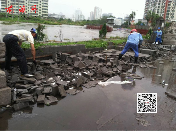 龙港城管组织人员清理大道转盘围墙砖头