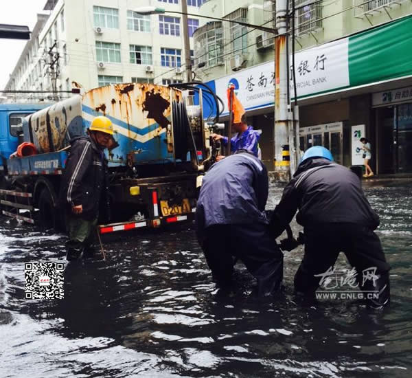 龙港网8月9日讯:今年第13台风“苏迪罗”给龙港带来了暴雨,有些街道出现大面积积水,严重影响市民出行安全。龙港市政管理处组织30来人从今天早上7点开始加班加点进行排涝工作,出动2辆疏通专用车,2辆清淤车在西三路、西城路、龙港大道、柳南路、人民北路、龙港大桥等主要道路进行积水排涝。截止发稿时,他们还在继续辛苦的工作,尽快消除全镇街道积水情况,给市民交通出行有个安全的环境。(李求利)